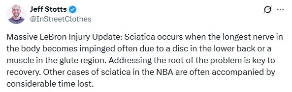 医学专家Evan Jeffries表示,詹姆斯将缺席2025-26赛季初期的比赛,他将在3-4周后重新评估坐骨神经痛,如果一切顺利,疼痛可能需要1-2周的恢复期,并且可能至少需要4-6周的时间才能康复。