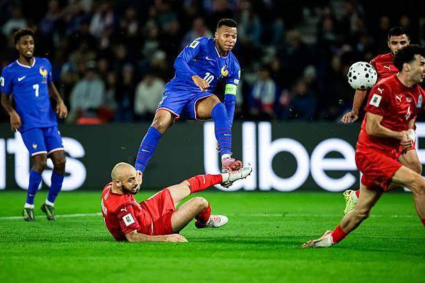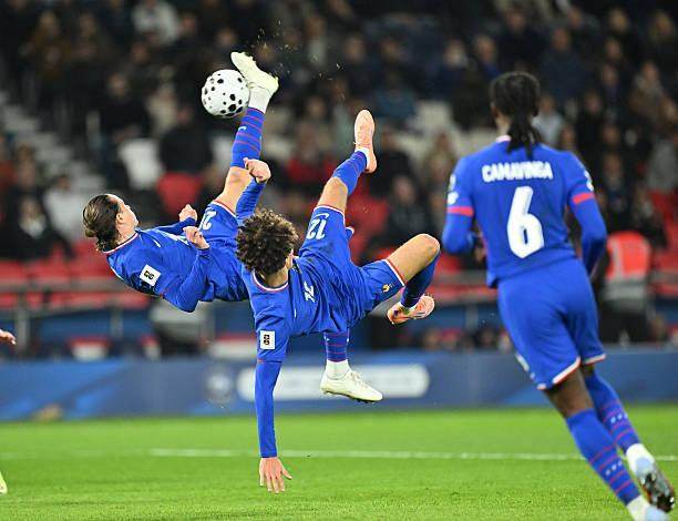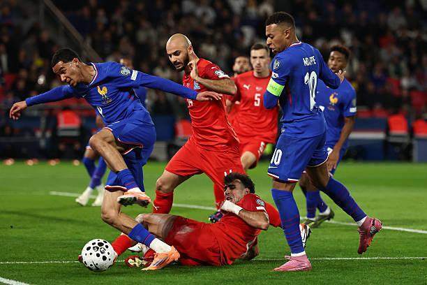两队的实力完全不在一个层面,上个月,比法国队弱很多的冰岛以5比0主场大胜阿塞拜疆,而在1995年,法国队曾以10比0狂胜同一对手。所以,这场比赛开始前,有不少人期待国家队来一场进球盛宴。然而,法国队在比赛上半时迟迟无法打开局面。如果注意观察德尚选择的442阵型,可以发现,他既有不得已而为之的背景因素,也有把不得罪豪门放在重要位置的考虑。在整个左边路,德尚安排的是特奥和科芒的搭档,这两人都在今年夏天离开欧洲去沙特淘金,德尚让他们首发,除了考察他们的状态,还在于——如果有人受伤,他们的俱乐部要更容易对付一些。既然是安排了两个边锋的阵容,看点就是两翼突破和中路包抄。然而,法国队最后的传球和射门始终不够精准,效力于卡拉巴赫俱乐部的阿塞拜疆门将马戈梅达利耶夫甚至无需多次扑救。最终,是姆巴佩以一己之力打破了僵局。上半场进入补时阶段,姆巴佩从中路开始带球突进,当时阿塞拜疆有七八名球员位于他正前方站好了阵势,但是姆巴佩接连带球硬吃对手,单骑闯关杀入禁区,面对门将冷静射门打破僵局,1比0。