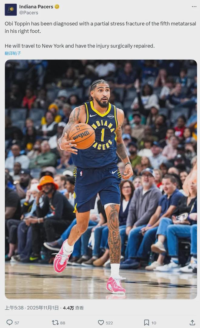 托平暂时离队前往纽约接受治疗,右脚将被植入螺丝固定,三个月之后进行重新评估。也就是说,至少要缺席到明年2月。如今步行者半个轮换都伤完了:哈利伯顿跟腱撕裂,马瑟林右脚大拇指受伤,麦康奈尔腿筋拉伤,内姆哈德左肩拉伤……