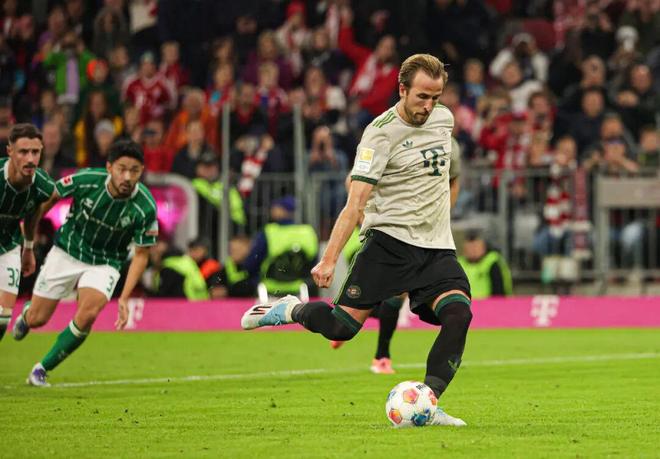 令人遗憾的是,凯恩在加盟拜仁首季并未结束“冠军荒”,直到上赛季他才随队捧起德甲冠军沙拉盘,收获职业生涯第一个团队冠军奖杯。2024-25赛季凯恩的联赛进球数虽然较此前一季有所下降——26球,但依然不妨碍他蝉联德甲金靴,同时成为德甲最快打进50球球员、前50场德甲进球最多球员,值得一提的是这两项跟“50”有关的德甲纪录前任保持者正是如今在英超大杀四方的哈兰德。本赛季的凯恩又一次火力全开,前8轮德甲狂轰12球,再算上欧冠、德国杯和弗朗茨·贝肯鲍尔超级杯,开季14场各项赛事打进22球,效率惊人!其中联赛第5轮拜仁主场4比0大胜不来梅,凯恩造点并亲自操刀命中,德甲生涯连续18次主罚点球弹无虚发,从未罚丢;下半场他又在门前右脚捅射完成梅开二度,打进拜仁生涯100球,超越C罗和哈兰德,成为本世纪欧洲五大联赛为单一俱乐部最快打进百球的球员,只用了104场比赛。