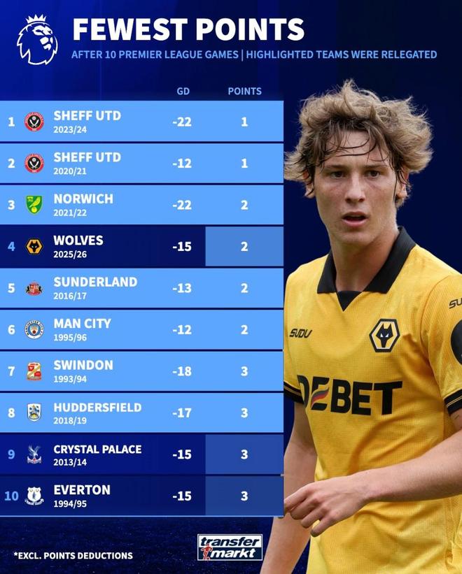 本赛季英超前10轮过后,狼队仅取得2平8负的成绩,打进7球丢22球,他们也因此解雇了原主帅维托尔-佩雷拉。英超历史联赛前10轮过后最差成绩:1. 谢菲尔德联(23-24赛季) 1分 净胜球-222. 谢菲尔德联(20-21赛季) 1分 净胜球-123. 诺维奇(21-22赛季) 2分 净胜球-224. 狼队(25-26赛季) 2分 净胜球-155. 桑德兰(16-17赛季) 2分 净胜球-136. 曼城(95-96赛季) 2分 净胜球-127. 斯文登(93-94赛季) 3分 净胜球-188. 哈德斯菲尔德(18-19赛季) 3分 净胜球-179. 水晶宫(13-14赛季) 3分 净胜球-1510. 埃弗顿(94-95赛季) 3分 净胜球-15【上咪咕独家看英超】