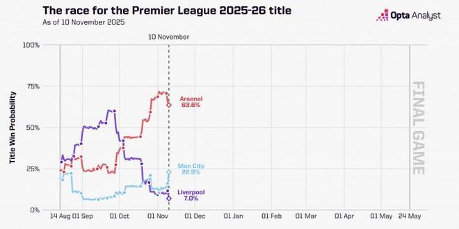 23岁的森林中场埃利奥特·安德森本赛季为森林在联赛已出场11次,贡献1球1助攻。目前他的德转身价为4500万欧元。消息来源:普莱滕伯格3 - 争夺奖杯概率记录的Opta晒英超本赛季截至目前的争冠概率走势:利物浦从赛季初被看好跌到目前的7%,阿森纳目前63.6%,曼城目前22.9%的。不过蓝月提升速率很可靠,这是不少阿森纳粉丝忧虑的。