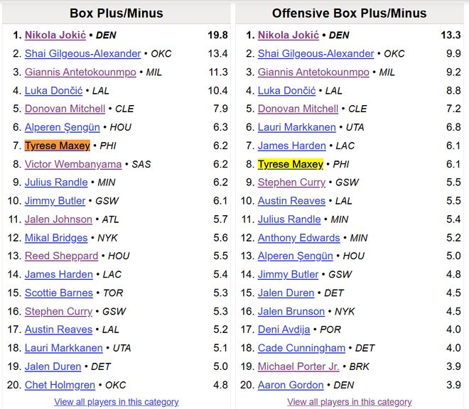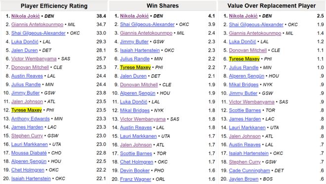 看高阶数据的话,马克西的惊喜可能更多。on/off值,马克西在场时,76人百回合能拿到118.4分、净胜对手3.7分,反之马克西不在场,76人百回合只能得到104.7分、净负对手8.6分,绝对的巨星级影响力;BBR的高阶数据,马克西的PER值、WinShare、VORP(不可替代值)、BPM分别排在联盟第12、第7、第6、第7,多项数据后面跟的还是库里、文班这样的大佬。