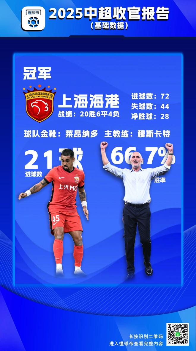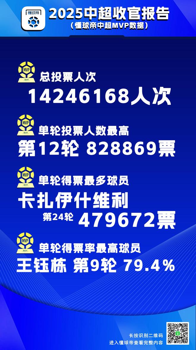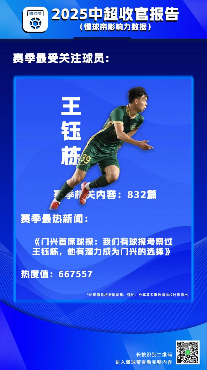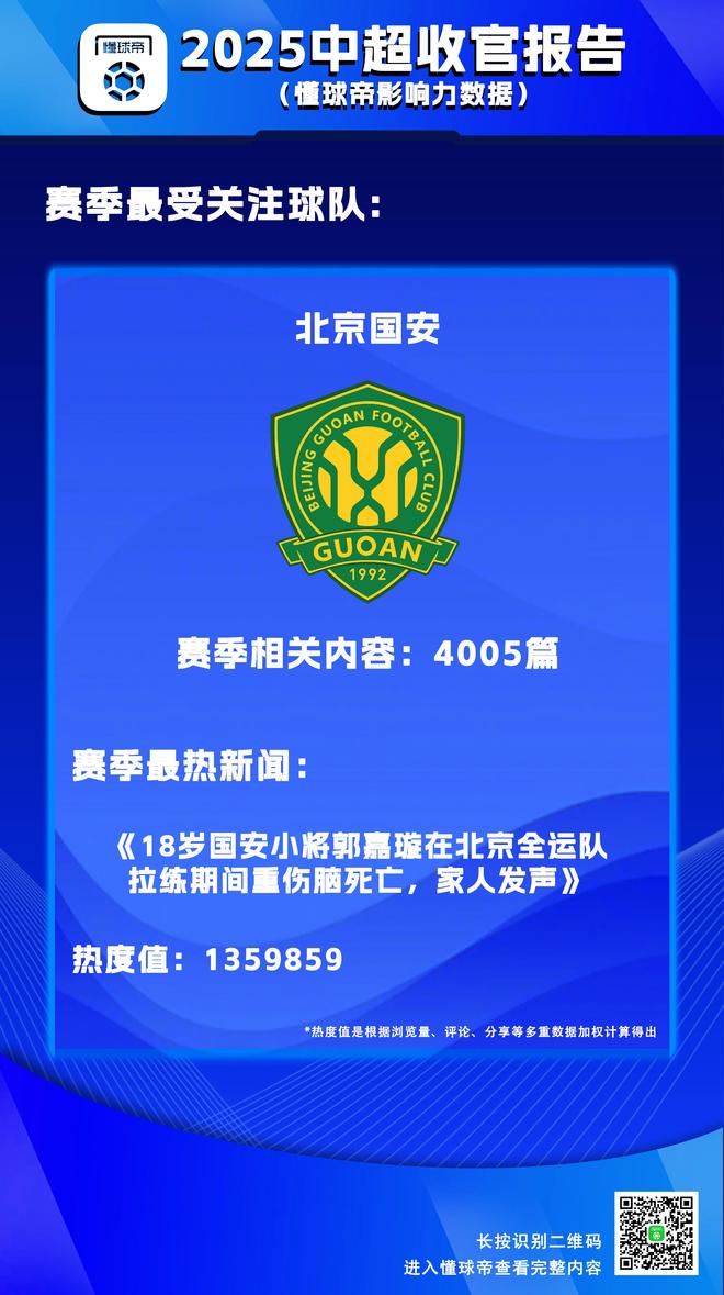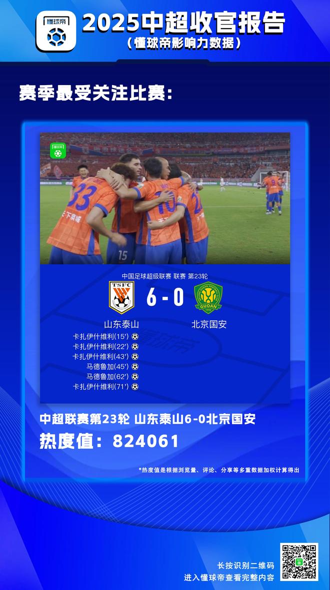 2025赛季中超联赛已经落下帷幕,一年一度的《懂球帝中超收官报告》正式跟大家见面啦。今年,我们将从懂球帝影响力数据、赛事基础数据以及中超MVP相关数据三个方面,来为您呈现这一整个赛季中超的盛况。Part1——影响力数据2025赛季是一个充满话题的赛季,联赛争冠、金靴争夺、保级大战、年轻球员涌现、球迷争端……在这一个赛季的时间里,共有接近3.5万篇中超相关内容在懂球帝上线,其中新闻内容占据1.8万篇,超过所有中超内容的50%,我们一如既往地为大家呈现了来自懂球帝以及各方的消息。而在这一个赛季的时间里,我懂球迷为中超联赛贡献了超过450万条评论。在我懂的评论区总是能够见到有趣的梗和梗图、颇有深度的见解以及充满温情的故事。信息是需要传播的,在这一个中超赛季里,懂球帝站内的中超内容共得到了超过190万次的分享。每一位分享内容的球迷都是信息的传播者,感谢我懂球迷能够将内容分享出去,让更多人能够了解到联赛中发生的种种,以及产生的各种消息。赛季最受关注新闻——布彭扎去世一个赛季,总会有一些让人能够牢牢记住的事情。有的是好的、快乐的,有的则是悲伤的。在本赛季中超联赛中,最受人关注的新闻是浙江队外援布彭扎去世的新闻。现在我们还记得当时的那个下午,懂球帝编辑部在看到外媒的相关报道时的那种错愕。对于这样的内容,我们处理的原则一定是慎之又慎,在相关消息曝出后,有的同事在监控信息,有的则是在求证不同信源,为的是尽可能准确地报道出相关信息,同时也尊重逝者,不希望他和爱他的人们受到失实信息的打扰。赛季最受关注比赛——山东泰山6-0北京国安在一个赛季的所有比赛中,总有一两场比赛会成为球迷们的共同记忆。本赛季中超联赛中,京鲁的两回合大战一定如此。在北京国安和山东泰山的首回合比赛中,北京国安主场6-1战胜了自己的老对手山东泰山。这个比分在当时便已经掀起轩然大波。然而,谁都没有想到的是,回到主场的山东泰山回敬了北京国安一个6-0。如此戏剧性的“复仇”戏码,也让这场比赛成为了本赛季最受关注的比赛。而两回合的京鲁大战也占据了本赛季最受关注比赛的前两名。此外,北京国安痛失好局被三镇扳平、何超世界波绝杀成都以及山东泰山逆转梅州这三场比赛,也跻身赛季最受关注的比赛TOP5。赛季最受关注球队——北京国安北京国安这支首都球队本赛季也从未缺少过话题,球队与世界名帅塞蒂恩的爱恨情仇、球队起起伏伏的表现、球员与球迷的故事等等,都让国安成为了这个赛季最受关注的球队。然而,实际上北京国安本赛季最受关注的新闻并非发生在一线队当中,而是发生在梯队。在北京全运队赴海外集训拉练期间,国安小将郭嘉璇在一次意外中头部严重受伤,陷入脑死亡状态,最终不幸去世,年仅18岁。在这次事件中,懂球帝始终持续跟进报道,希望能够履行我们作为媒体的社会责任,为各界还原、厘清整个事情的经过,解开事件中的种种疑点。并且也希望能够尽微薄之力帮助到这个遭遇不幸的家庭。赛季最受关注球员——王钰栋如果让各位从本赛季中超的所有球员中选出一个你认为最受关注的球员,王钰栋一定会是一个最普遍的答案。事实也确实如此,在过去的一个赛季中,王钰栋成为了最受关注的中超球员。本赛季,王钰栋实现爆发,打出了状态极佳的一个赛季。其现象级的表现加上各级国字号的加持,让王钰栋成为了如今最受关注的中超球员。而关于王钰栋的最受关注的新闻,是一则门兴球探对于王钰栋的表达。这也体现出了人们对于王钰栋外出留洋的期待与渴望。Part2——赛事基础数据冠军——上海海港金靴——法比奥联赛射手榜球队进、丢球榜联赛出场王TOP5关键传球榜TOP5抢断榜TOP5解围榜TOP5零封榜TOP5纪律相关数据赛季上座人数相关数据Part3——中超MVP数据,参与热度创历史新高本赛季30轮的懂球帝中超MVP评选中,共收到了约1425万人次的有效投票,这一数据相比于去年的1178万人次提升了近21%。其中,单轮投票人数最高的是第12轮,达到了828869人次,这一数据也是历年懂球帝中超MVP评选中,人数最高的一次。此外,本赛季单轮得票最多的球员是卡扎伊什维利,他在第24轮共收获了479672张票。在那一轮对阵上海申花的比赛中,瓦科凭借着自己的帽子戏法,战平了强敌上海申花,他也因此实现了连场戴帽的成就。得票率方面,王钰栋在第9轮的比赛中得到了79.4%的得票率。在那场比赛中,他打入了一记世界波,进球后,王钰栋眼含热泪与队友双手指天,悼念着刚刚离世的队友布彭扎。在本赛季懂球帝中超MVP候选提名方面,瓦科和法比奥这一对同年同月同日生的金靴争夺对手都得到了8次提名。而两人整个赛季也均3度摘得懂球帝中超MVP,分别收获了三座我懂奖杯。此外,除了瓦科和法比奥之外,还有基莱斯、王钰栋以及克雷桑本赛季都拿到了3座懂球帝中超MVP奖杯,这5位球员也包揽了本赛季一半的懂球帝中超MVP的奖项。同时,懂球帝在此想感谢每一位参与到懂球帝中超MVP评选活动中的评审老师们,感谢各位老师对于懂球帝中超MVP栏目的大力支持。本赛季,我们对懂球帝中超MVP栏目进行了一定的升级,并希望通过十余次对MVP得主的专访,来拉近球迷与球员及俱乐部之间的距离。感谢每一支俱乐部对我们的支持与帮助,最终让各种形式的颁奖与采访得以最终落地