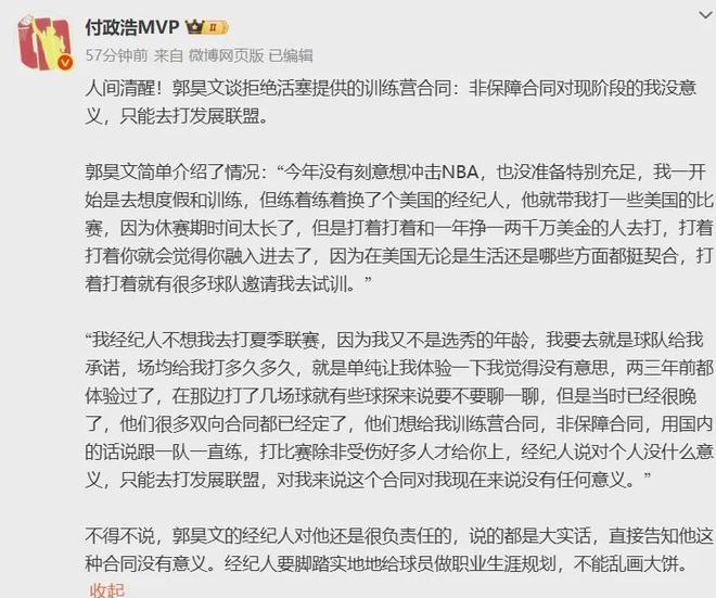 近日接受采访,郭昊文首次谈及拒绝NBA球队活塞,表示:“那个合同没有保障,只是训练营合同,只能去打发展联盟,很难在正赛登场亮相。”国内媒体人对郭昊文及他经纪人的决定,给予了高度评价,如下:郭昊文出生于2000年1月31日,今年25岁,曾在22年参加NBA选秀大会但落选,同年代表独行侠出战夏季联赛,两场比赛里场均上阵9.2分钟得到5分1助。这哥们曾是中国国青队的第一大腿,参加过19年的耐克篮球峰会拿下8分1助,19年U19世界杯对阵波多黎各男篮狂轰34分11板11助炸裂数据,带领中国男篮99-94取胜,是中国在该赛事首个斩获三双的球员......18年,郭昊文进入CBA正式开启职业生涯,那时也是被寄予厚望,被认为会是继孙悦(07届次轮第10号秀)之后,又一个能够打进NBA的中国后卫,可惜终究让人失望了,甚至效力八一队以及上海队时期均传出了桃色绯闻。最严重一次,莫过于23-24赛季上海队时期,突然在球队大名单中消失,甚至有人说他被管吃管住了职业生涯彻底结束,但好在事情没有那么严重,去年夏天转投同曦队开启新篇章。24-25赛季,在同曦队的郭昊文迎来了生涯巅峰,常规赛出战38场首发20次,场均上阵33.7分钟,贡献16.1分4板3.2助,帮助球队历史上首次杀进季后赛;然而在季后赛,郭昊文表现下滑严重,场均只有8分4.5板2.5助进账。今年夏天,放弃冲击NBA机会的郭昊文,同曦队也执行了他的球队选项,意味其新赛季为其的合同年,需要打出更加亮眼的发挥,来为自己明夏争取一份D类顶薪合同。林葳已经在NCAA打球,郭昊文新赛季就是同曦队的第一本土核心,说不定能轰出场均得分20+。