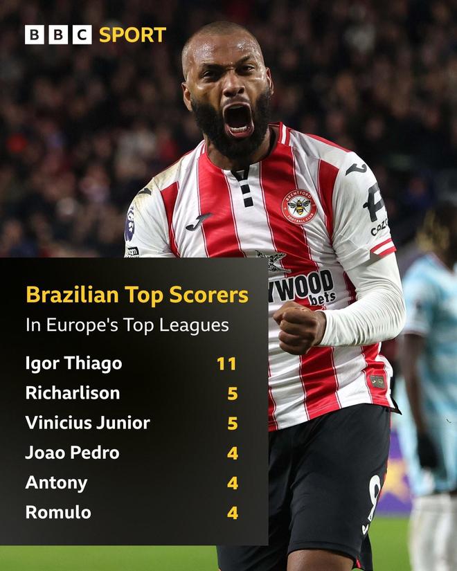 北京时间11月30日,英国媒体节目《Match of the Day》统计出了本赛季至今欧洲五大联赛巴西球员射手榜,本轮英超完成梅开二度帮助布伦特福德主场3-1击败伯恩利的伊戈尔-蒂亚戈以11球断档领先,维尼修斯和安东尼上榜。本赛季至今欧洲五大联赛巴西球员射手榜:1. 伊戈尔-蒂亚戈(布伦特福德) 11球2. 里沙利松(托特纳姆热刺) 5球2. 维尼修斯(皇家马德里) 5球4. 若昂-佩德罗(切尔西) 4球4. 安东尼(皇家贝蒂斯) 4球4. 罗慕洛(RB莱比锡) 4球【上咪咕独家看英超】