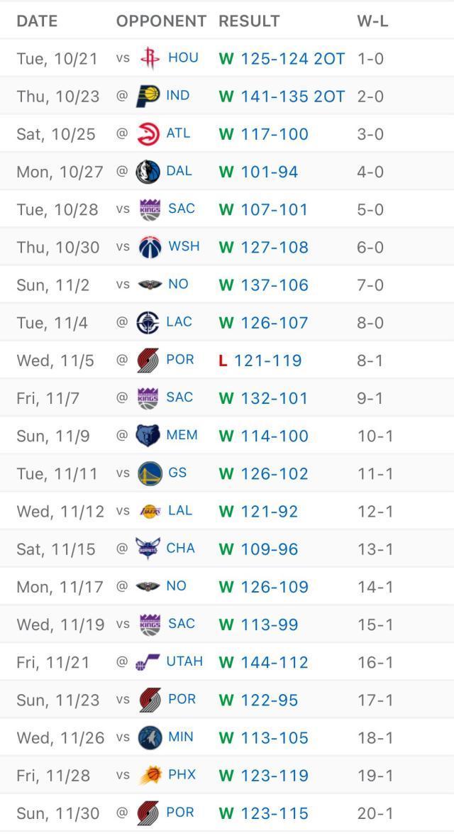 北京时间12月1日,客场面对本赛季唯一击败过自己的开拓者队,雷霆靠着末节的关键球决胜以123比115击败对手,豪取12连胜。此役过后,雷霆本赛季战绩已经来到20胜1负,他们成为了NBA历史第4支开局前21场赢下至少20场的队伍。此役雷霆缺少首发内线哈尔滕施泰因,他因为右小腿比目鱼肌拉伤将缺席未来10-14天的比赛。但在上一场迎回杰伦·威廉姆斯后,雷霆的阵容得到填补。这一战雷霆6人得分上双,除了拿到26分的亚历山大,还有16分8篮板5助攻的杰伦·威廉姆斯、19分9篮板的霍姆格伦,替补席上米切尔和以赛亚·乔也合计砍下32分。根据统计,NBA历史此前有三支球队做到过开季前21战至少20胜,分别是2015-16赛季的勇士、1993-94赛季的火箭和1969-70赛季的尼克斯,其中火箭和尼克斯最终都完成夺冠,勇士收获73胜的常规赛历史最佳战绩,但在总决赛3比1领先的情况下遭到骑士逆转。(文/幻仁)