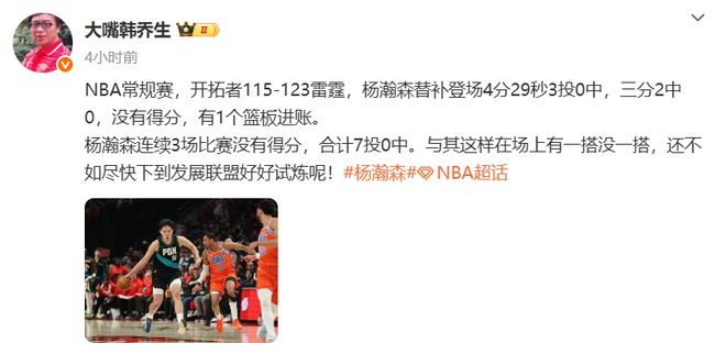 看着杨瀚森在波特兰的替补席上,蜷缩在最靠外的位置,镜头扫过时,他的眼神里有渴望,有迷茫,也有一丝被现实冲刷后的麻木,北京时间12月1日,开拓者主场115-123不敌雷霆,吞下两连败,而这场失利中,属于中国球迷的那份关注,更多凝结在短短的4分29秒里,杨瀚森替补登场3投0中,三分线外两次尝试一次打铁一次尴尬的三不沾,数据栏上最终只留下1个篮板和1次犯规,更刺眼的是,这已经是他连续第三场比赛一分未得,三场合计7投0中,比赛可以复盘,数据冰冷陈列,但背后那个20岁年轻人正在经历的NBA初体验,远比技术统计复杂,也残酷得多回看他在场上的那几个回合,确实能品出些许苦涩与挣扎,第一次机会,他在低位获得了单打切特·霍姆格伦的机会,这是教练组或许想看到的对位试探,但勾手偏出,紧接着,他在底角和弧顶分别获得三分空位,这是现代篮球对空间型内线的要求,可惜先后以打铁和三不沾告终,尤其是第三次出手,那份出手前的犹豫,通过屏幕都能感受到,连续打不进后,信心如沙漏中的细沙般流逝,动作随之变形,这就是新秀墙?不,这或许是比新秀墙更冰冷的现实:当你的每一个短板,如移动速度、投射稳定性,都被置于NBA级别的显微镜和攻防节奏下无情审视时,球场会变得无比空旷,又无比拥挤,空旷到你不知机会何时再来,拥挤到对手的补防总在你出手瞬间到位然而,将杨瀚森目前的困境简单归咎于他个人手感冰凉或能力不足,是有失偏颇的,他的路越走越窄,是个人特质与球队生态剧变共同作用的结果,开拓者本赛季的目标和气质已然不同,经历了多年摆烂,球队本赛季展现出与对手纠缠的能力,战绩有所起色,目标直指季后赛或附加赛席位这种赢球导向的务实主义,在代理主帅斯普利特上任后更为凸显,他需要战绩来为自己转正增加筹码,自然更倾向于使用即战力,而非花费大量比赛成本去培养一个远未准备好的新秀,球队的战术标签也变得清晰:极致的快节奏和防守撕咬,他们的节奏值高居联盟第一,场均抢断联盟最多,快,成了这支开拓者的新名片,却恰好戳中了杨瀚森当下最大的软肋,移动速度,在过去几场比赛中,他因速度问题在攻防两端都显得游离,防守端被“军训”的场景屡见不鲜更雪上加霜的是队内竞争的激化,随着“黑旋风”罗伯特·威廉姆斯伤愈复出并完成状态恢复,开拓者内线的轮换次序彻底明朗:首发克林根,替补罗威,第三选择是上场有过亮眼表现的里斯,杨瀚森不幸地沦为了球队的第四中锋,彻底跌出了常规轮换,即便在对阵雷霆这场双方比分紧咬、开拓者半场还领先1分的比赛中,即便球队的快攻打法在雷霆面前受阻,需要改善半场进攻时,教练组也没有想起他,这残酷地说明,在当下的战术版图和信任序列里,杨瀚森已近乎被遗忘,他坐在场边,目睹了球队与偶像约基奇的球队交锋,却只能做一名落寞的看客于是,名嘴韩乔生提出的那个观点,便显得格外现实与中肯:“与其这样在场上有一搭没一搭,还不如尽快下到发展联盟好好试炼呢!”我深以为然,这并非贬低或放弃,而是一条在现实夹缝中,最可能通往未来的务实之路,在NBA坐穿冷板凳,获得的只有虚无的“体验”,没有实战的锤炼,比赛感觉、进攻选择、防守阅读,这些都需要在真刀真枪的比赛中积累,发展联盟的竞技水平固然无法与NBA同日而语,但对于杨瀚森而言,那里有他最急需的东西:稳定的出场时间和犯错的空间,开拓者随队记者此前就透露,球队计划在12月初将他下放至附属的“撕裂之城混音队”,这并非惩罚,而是球队培养链条中常见且必要的一环,像吕佩尔、克里斯·穆雷等年轻球员都有过类似的经历那么,如果下放发展联盟,杨瀚森应该带着怎样的目标和心态去“试炼”呢?我认为,他需要完成一场极其精准、目标明确的“自我改造”首先,必须暂时放下“全能中锋”的包袱,进行“功能化”聚焦,在发展联盟,他不应再执着于面框单打或展示不稳定的三分(本赛季NBA三分命中率仅8.3%),他的核心任务应锁定在两方面:一是将掩护做得如城墙般坚固,并快速外弹或内切,成为战术发起的可靠轴心;二是在防守端,专注于护框和篮板保护,哪怕移动慢,也要通过预判和站位弥补,提升防守的存在感,他需要证明自己至少有一到两项技能,能达到NBA轮换的“及格线”其次,心态上要从“NBA球员”转变为“渴望生存的斗士”,发展联盟环境艰苦,往返奔波,对抗激烈但技术粗糙,他必须做好心理准备,将那里的每场比赛都视为救命稻草,打出侵略性和求胜欲,此前被下放时,他曾有过单场21分9篮板3盖帽的表现,这说明他具备在低级别联赛统治攻防的潜力,他需要持续输出这种表现,重新唤醒管理层对他“可用性”的记忆最后,是利用好波特兰便利的地理条件,进行“穿梭式”提升,混音队主场就在波特兰北部,便于球队监控,杨瀚森应主动与NBA教练组保持沟通,将在发展联盟暴露的问题、取得的进步及时反馈,同时,在回归NBA跟随训练时,要更有针对性地加练,特别是利用VR设备分析比赛录像,弥补速度劣势的战术理解杨瀚森的NBA前景,正如前国手朱芳雨所言,可能“连1%都不到”,这1%的机会,不在波特兰替补席的尽头,而在发展联盟的赛场、在训练馆的汗水里、在一次又一次枯燥的挡拆与防守滑步中,他的路,在NBA的层面看似越走越窄,但换一个赛道,或许能凿出一线生机对于这位20岁的年轻人,我们没有理由嘲讽他“树懒”或“探店型运动员”,