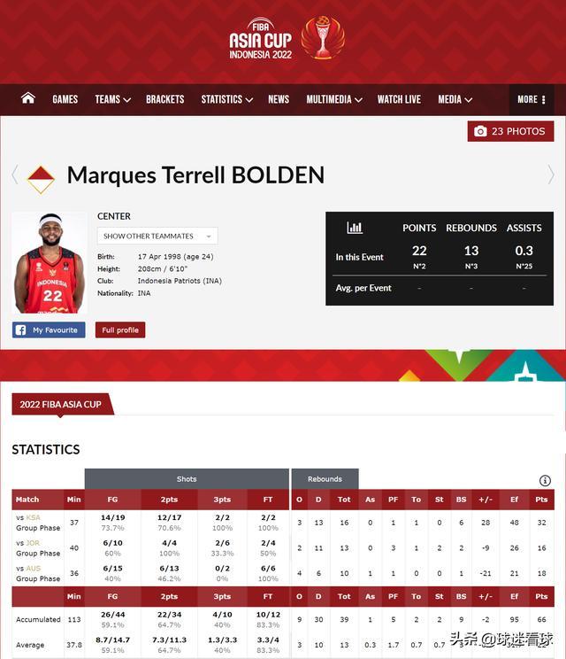马奎斯-博尔登,1998-4-17生于大洋彼岸德州迪索托、身高2米08(也有说2米11的),体重达到112.0公斤,司职大前锋和中锋两个位置。NCAA时期,他虽然效力于名校杜克大学,但在2019年博尔登参加NBA选秀大会时并没有球队给他机会,最终遗憾落选。之后,博尔登只能流离在发展联盟寻求机会,在2020年,骑士曾官方宣布与其签下过十天短合同。在代表盐湖城星光队出战NACC的比赛中,博尔登有着不错的数据,上赛季场均可以得到12.3分9.2板1断1.9帽的成绩单,随后被印尼方面看中,并被归化参加东南亚运动会,率队夺得金牌。从此,他一直跟随印尼出战,在之前的三场亚洲杯小组赛中,他场均要打37.8分钟的时间,场均砍下22分13篮板3个盖帽,对阵沙特一役怒轰32分16篮板6盖帽的超级大两双,堪称恐怖,具体技术统计如下图所示(截图自FIBA官网):