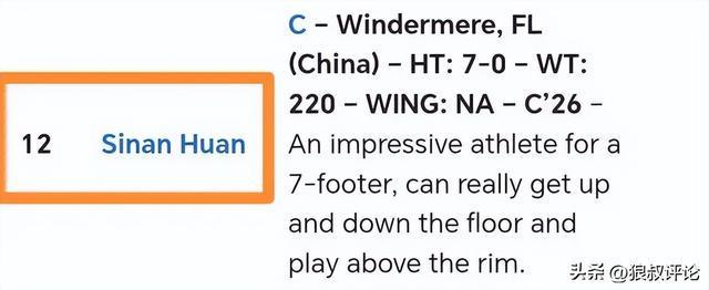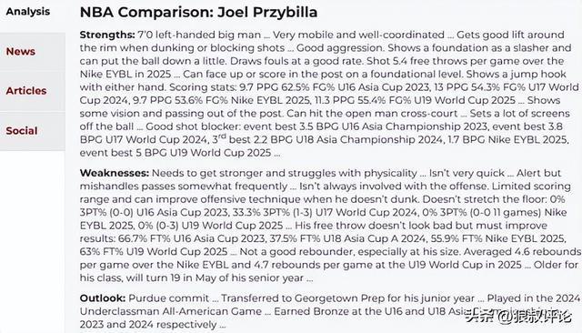 北京时间12月1日,中国球员郇斯楠迎来高四赛季常规赛首秀,Georgetown Prep 63:67 St.John’s。郇斯楠首发出场26分钟,12投9中,罚球4中2;得到20分10篮板1助攻1盖帽。 而上一周美高热身赛,郇斯楠同样表现出色,个人爆砍26分获得外界的关注和认可。这名中国年轻内线球员已经承诺加盟普渡大学,高四赛季结束后,将会转战NCAA赛场。 此前,美国选秀媒体NBA Draft Room的最新预测显示,郇斯楠有望在2028年NBA选秀大会首轮第12顺位被选中。球探报告指出,他身材高大,运动能力出色,篮板争抢是其明显优势,同时在球场上的领袖气质和对球权的掌控意愿正在提升。 NBAdraft更新郇斯楠球探报告:综合评分86,模板乔尔·普尔兹比拉。 具体评价如下:优势:一名身高约2米13的左撇子大个子球员,机动性很强且协调性出色,在扣篮或封盖时起跳充分,具备良好的侵略性。展现出作为空切手的基础,并且可以稍微运一下球。造犯规能力不错,在2025年耐克EYBL联赛中场均获得5.4次罚球,具备面框或低位背身得分的基础。能使用任一手完成跳勾。得分数据如下:2023年U16亚洲杯场均9.7分,命中率62.5%;2024年U17世界杯场均13分,命中率54.3%;2025年耐克EYBL场均9.7分,命中率53.6%;2025年U19世界杯场均11.3分,命中率55.4%,展现出了一定的视野和低位策应能力。能够传球找到对侧的空位队友…频繁进行无球掩护、出色的盖帽手:2023年U16亚洲锦标赛场均3.5次盖帽(赛事最佳);2024年U17世界杯场均3.8次盖帽(赛事最佳);2024年U18亚洲锦标赛场均2.2次盖帽(赛事第三);2025年耐克EYBL场均1.7次盖帽;2025年U19世界杯场均5.0次盖帽(赛事最佳)。劣势:需要变得更强壮,在与身体对抗强的对手对位时表现挣扎,横移速度不算很快,虽然警觉但接球失误较为频繁,在进攻中并不总是参与感很强。得分范围有限,并且在非扣篮终结时,其进攻技术有待提高。不具备拉开空间的能力:2023年U16亚洲杯三分命中率0%(0投0中);2024年U17世界杯三分命中率33.3%(3投1中);2025年耐克EYBL(11场比赛)三分命中率0%(0投0中);2025年U19世界杯三分命中率0%(3投0中)。他的罚球动作看起来不差,但必须提升命中率:2023年U16亚洲杯罚球命中率66.7%;2024年U18亚洲杯A级赛罚球命中率37.5%;2025年耐克EYBL罚球命中率55.9%;2025年U19世界杯罚球命中率63%。对于他的身材来说,不是一个好的篮板手。在2025年耐克EYBL中场均4.6个篮板,在2025年U19世界杯中场均4.7个篮板,在他的年级中年龄偏大,将在高四那年的5月份年满19岁。前景展望:已承诺加盟普渡大学…高中三年级时转学至乔治城预科学校,参加了2024年全美低年级学生全明星赛,分别在2023年和2024年随队获得U16和U18亚洲锦标赛铜牌。
