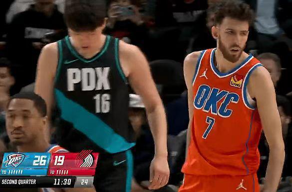 当杨瀚森在连续两场得分为0分后,面对与联盟第一的雷霆对决,开拓者中锋克林根因病缺席。开拓者此役在派出五小首发阵容,杨瀚森首节比赛未能获得登场机会。杨瀚森在第二节替补登场4分29秒,但他3中0颗粒无收,其中两次外线三分投篮不中,仅贡献0分1篮板1犯规,在场正负值+3。
