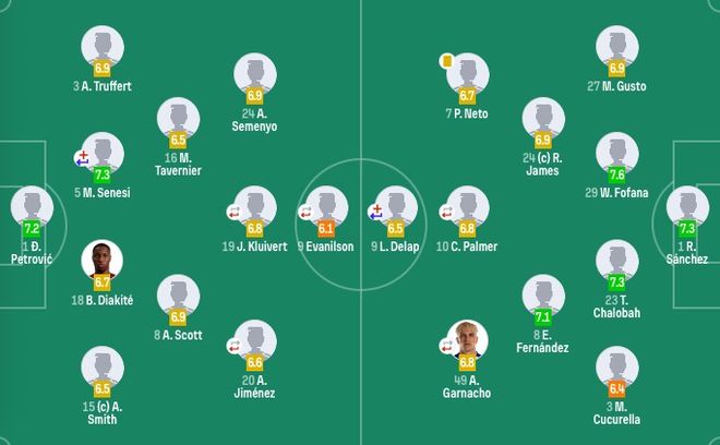 【出场阵容】切尔西首发:1-桑切斯、3-库库雷利亚、23-查洛巴、27-古斯托、24-詹姆斯、29-福法纳、8-恩佐、10-帕尔默(58'20-若昂-佩德罗)、49-加纳乔(77'41-埃斯特旺)、7-内托、9-德拉普(32'38-吉乌)替补未出场:12-约恩森、34-阿奇姆彭、5-巴迪亚希勒、21-哈托、17-桑托斯、11-吉滕斯伯恩茅斯首发:1-彼得洛维奇、3-特鲁菲尔特、5-塞内西(62'23-希尔)、8-斯科特、9-埃瓦尼尔森(87'26-于纳尔)、15-史密斯、16-塔弗尼尔、18-迪亚凯特、19-克鲁伊维特(74'7-布鲁克斯)、20-希梅内斯(74'21-阿德利)、24-塞梅约替补未出场:40-丹尼斯、2-朱利安-阿劳霍、6-索莱尔、22-克鲁皮、27-冈萨雷斯