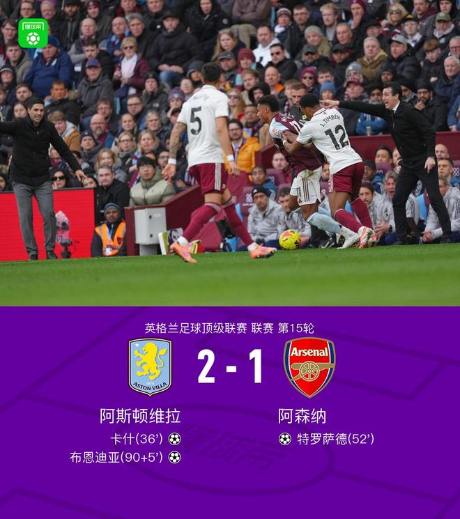 第90+5分钟,布恩迪亚读秒绝杀!维拉2-1阿森纳!