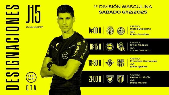西班牙足协官方公布了本周六西甲四场比赛的裁判安排,弗朗西斯科-埃尔南德斯将执法巴萨客战贝蒂斯。本周六西甲裁判安排比利亚雷亚尔vs赫塔费 主裁:马特奥-布斯克茨(VAR:巴勃罗-冈萨雷斯)阿拉维斯vs皇家社会 主裁:哈维尔-阿尔韦罗拉(VAR:卡洛斯-德尔塞罗)皇家贝蒂斯vs巴塞罗那 主裁:弗朗西斯科-埃尔南德斯(VAR:哈维尔-伊格莱西亚斯)毕尔巴鄂竞技vs马德里竞技 主裁:亚历杭德罗-穆尼斯(VAR:马里奥-梅莱罗)