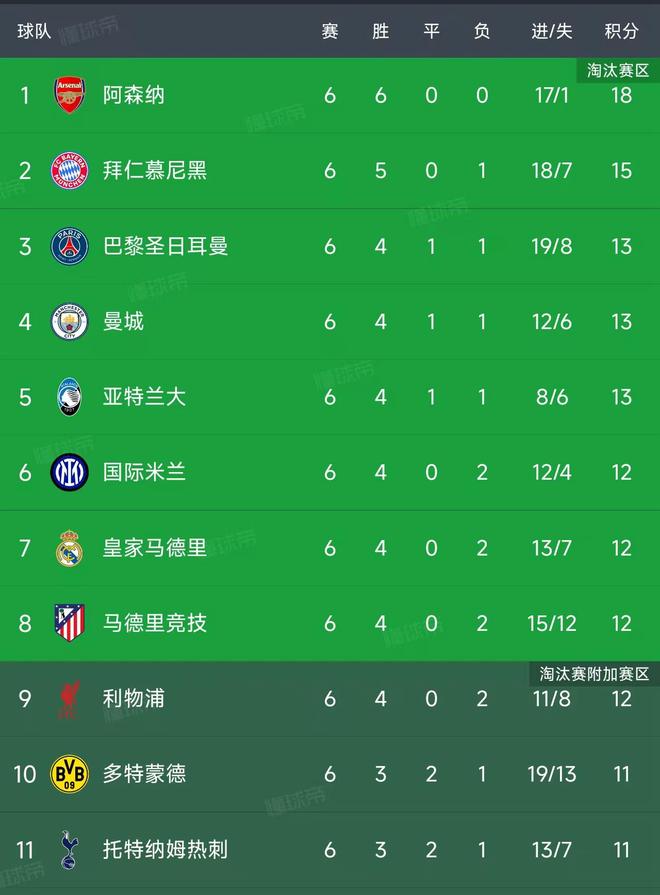北京时间12月11日,欧冠第6轮结束了所有比赛,我们一起看看最新积分榜变动!欧冠最新积分榜阿森纳是唯一保持全胜的球队,客场3-0战胜了布鲁日,豪取6连胜,以18分稳居第一,马杜埃凯梅开二度,马丁内利世界波破门。本赛季的枪手在英超和欧冠都是领头羊,但是随着赛季的深入,他们肯定会遇到更多的困难和压力,最重要的就是要保持稳定和信心。枪手6连胜卫冕冠军巴黎客场0-0闷平了毕尔巴鄂竞技,这一场比赛巴黎场面占据上风,全场72%控球率,18-9射门数,但是多次射门被乌奈-西蒙神扑拒绝,只能吞下欧冠首场平局,目前以4胜1平1负积13分暂列第三名,落后第二名拜仁2分,落后榜首的阿森纳5分。毕尔巴鄂竞技目前以1胜2平3负积5分暂列第28名,要想挤进附加赛并不容易。巴黎交白卷皇马和曼城迎来强强对决,这一场比赛皇马遇到了伤病问题,卡瓦哈尔、阿诺德、米利唐都在伤病名单,姆巴佩虽然进入了大名单,但是没有登场。比赛开始,皇马的气势还是很不错的,维尼修斯在禁区附近造成了努内斯的犯规获得了任意球,巴尔韦德任意球攻门,击中了人墙变线出了底线。第28分钟,贝林厄姆直塞找到罗德里格,后者带球杀入禁区,打远角得手,皇马1-0取得了领先。库尔图瓦难救主比分落后的曼城持续加强攻势,第35分钟,曼城利用角球战术由奥赖利门前补射破门,双方回到了同一起跑线。第43分钟哈兰德被吕迪格抱住摔倒造点成功,并且主罚命中,曼城2-1反超。第45分钟曼城还有扩大比分的机会,但是库尔图瓦神勇扑出了哈兰德和谢尔基的射门。下半场回来,两队互有攻守,库尔图瓦和多纳鲁马都做出了精彩的扑救,最终皇马主场1-2失利,进入12月份4场比赛仅仅拿到1胜,目前欧冠4胜2负暂列第7名。哈兰德点射致胜曼城4胜1平1负和巴黎、亚特兰大持平暂列第4名。多特主场2-2战平了博德闪耀,以11分暂列第10名。纽卡斯尔联客场2-2战平了勒沃库森,以10分暂列第12名,药厂9分第20名。尤文主场2-0战胜了帕福斯迎来欧冠第二场胜利2胜3平1负积9分暂列第17名。