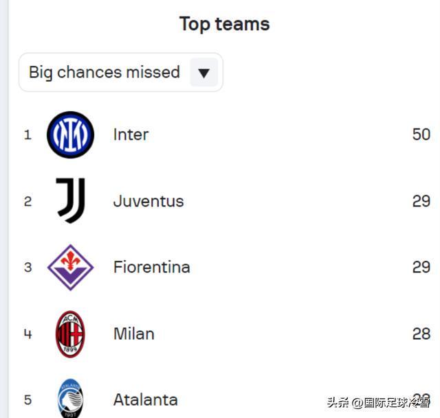 此战劳塔罗3次浪费“黄金机会”,小图拉姆和皮奥各有1次,单场比赛就5次浪费良机,也让国米在意甲浪费黄金机会的榜单上的领先优势进一步扩大——50次浪费黄金机会的国米,领先第二名已达21次之多。