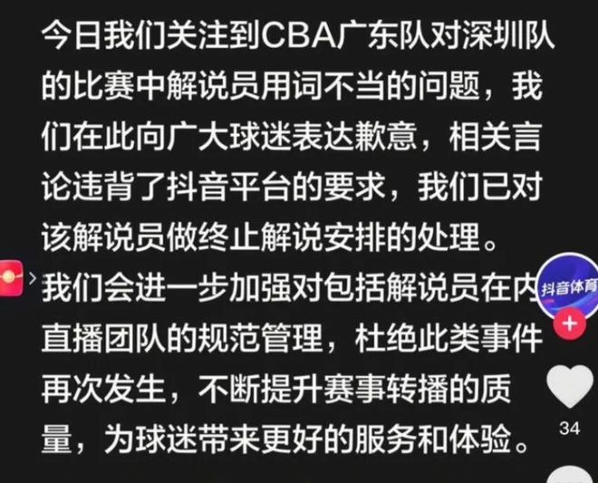 显然,这就是这个解说在搞地域黑那一套,愤怒的广东球迷马上开始投诉,抖音也是在当晚反应迅速,立即解雇了这个解说,并且公开道歉。要知道,广东的主场不仅仅有广东人,还有很多从北方来打工的人,因此这个解说是把全国人民都骂了一遍,自然是要向广大球迷进行道歉。